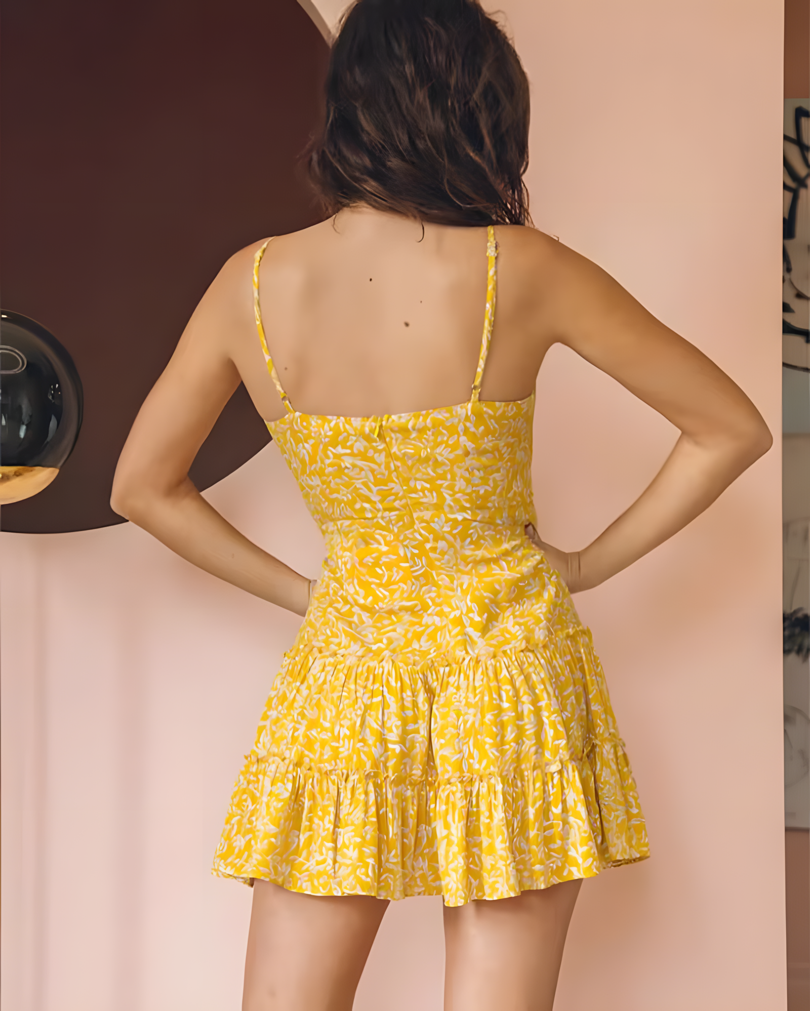 Radiate summer charm with the Bella Dress, a stunning blend of casual elegance and playful design. Crafted with lightweight cotton and polyester, this yellow floral mini dress features delicate white prints, frill trim, and a flattering empire waistline. The tie-up spaghetti straps and ruffle accents make it a perfect choice for beach days, casual outings, or brunch with friends.