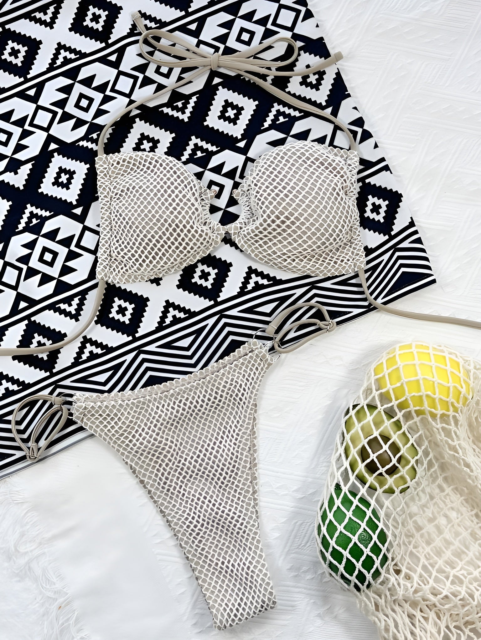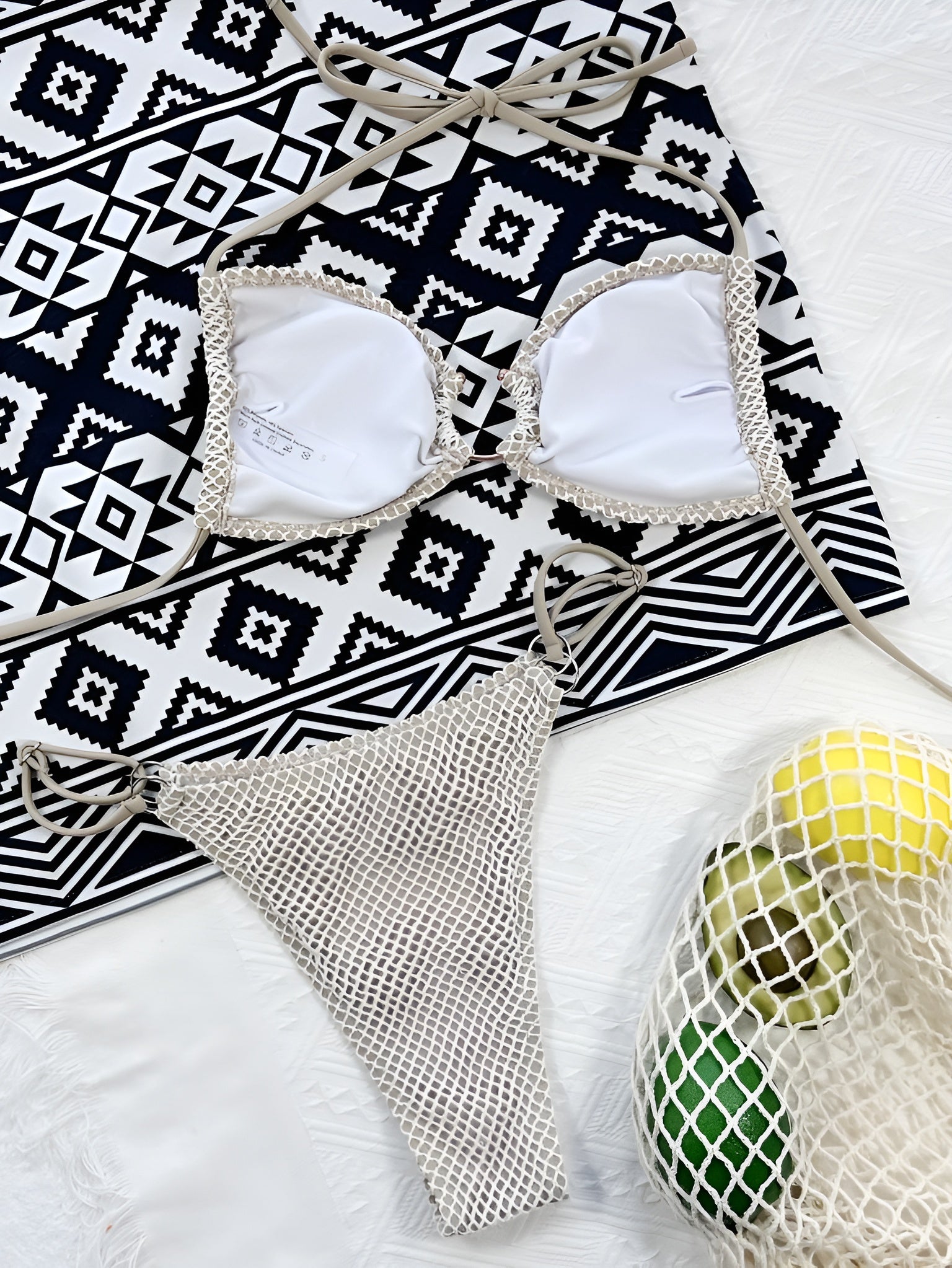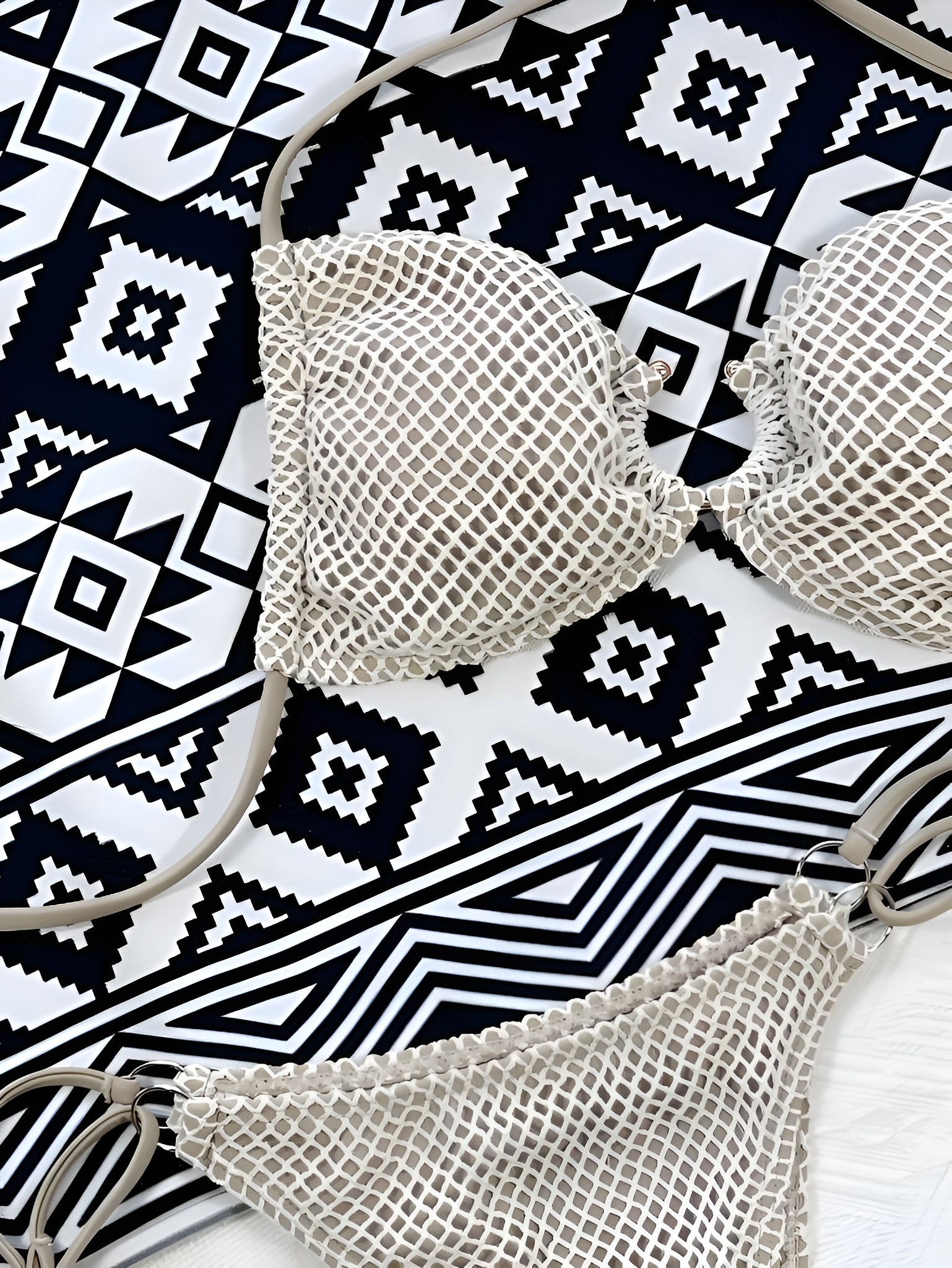 The Esme bikini in elegant white features a unique netted design, adding a touch of bold sophistication to your swimwear collection. This sexy triangle bikini offers the perfect balance of allure and effortless beachside charm.