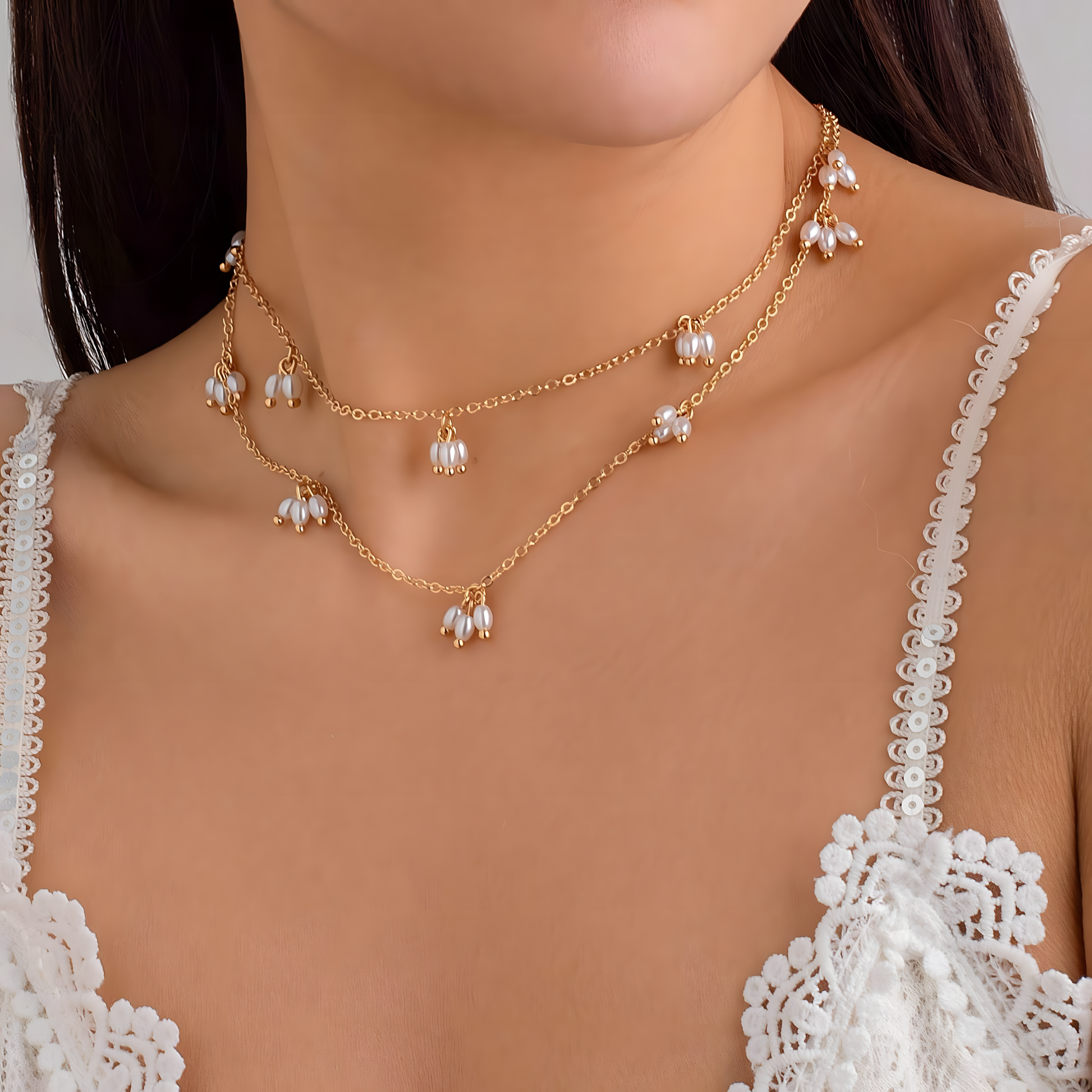 The Luna Necklace is a delicate double-layered pearl necklace, perfect for adding a touch of grace to any look. Paired with matching tassel earrings, this set embodies effortless sophistication. Available in gold and white.